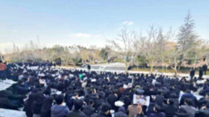 [Foto y texto de @anjmotahed en X. «31 de enero. Concentración y sentada de estudiantes de la Universidad de Mashhad en conmemoración del difunto Parsa Saffar. Durante este evento, los estudiantes exigieron la liberación de Amin Pourfarhang»]