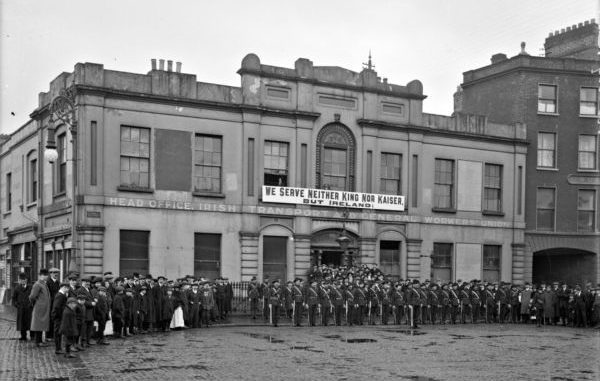 [Imagen: Miembros del Ejército Ciudadano Irlandés frente al Liberty Hall, bajo una pancarta que proclama: «¡No servimos ni al rey ni al káiser, sino a Irlanda!» (Wikimedia Commons)]